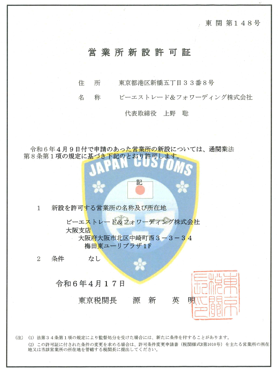 この度、ビーエストレード&フォワーディング株式会社 大阪支店は令和6年4月17日付けで、通関業法第8条第1項の規定に基づき、営業所新設許可(東関 第148号)が下りましたのでお知らせいたします。