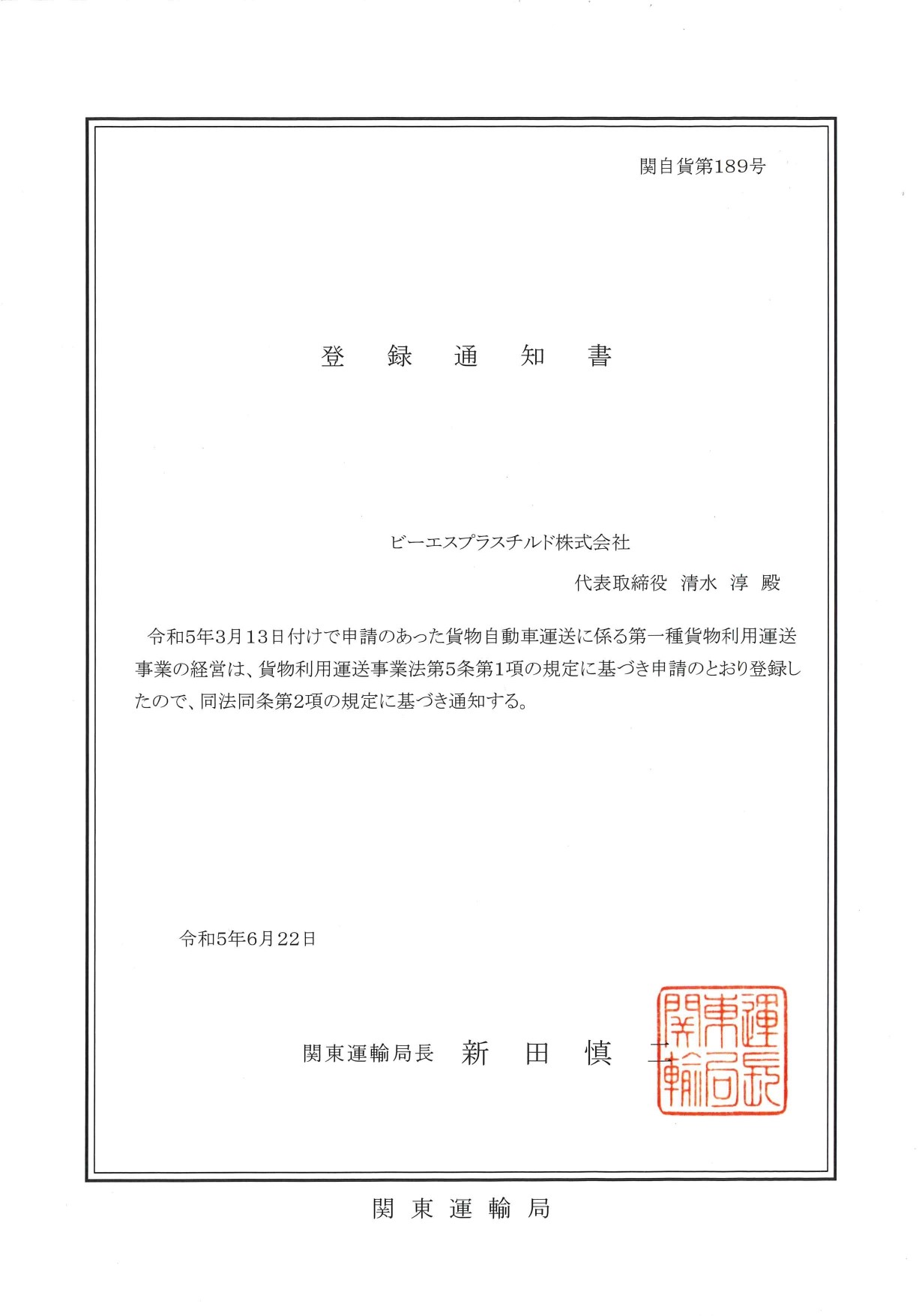 この度、ビーエスプラスチルド株式会社は令和5年6月22日付けで、第一種貨物利用運送事業(関自貨第189号)の登録をしましたのでお知らせいたします。
